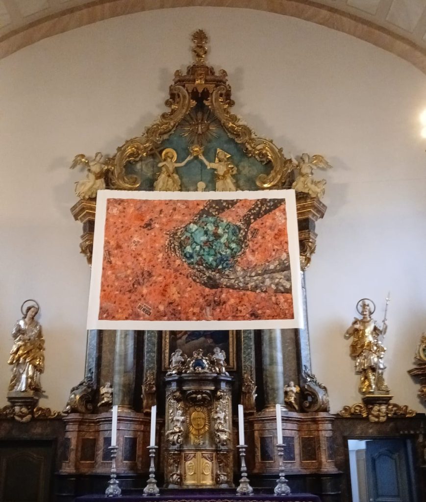 In den warm-roten Raum greifen vier Arme: Form und Farbe nach deuten sie auf unterschiedliche Menschen – möglicherweise aus anderen Kontexten, ethnischen Zugehörigkeiten, verschiedenen Geschlechtern – hin. Ihre Hände berühren gemeinsam sachte die Erdkugel, lassen ihr aber auch Spielraum. Wahrhaftig eine zerrissene Welt, verwundet und brüchig. Noch gehalten oder schon preisgegeben?
