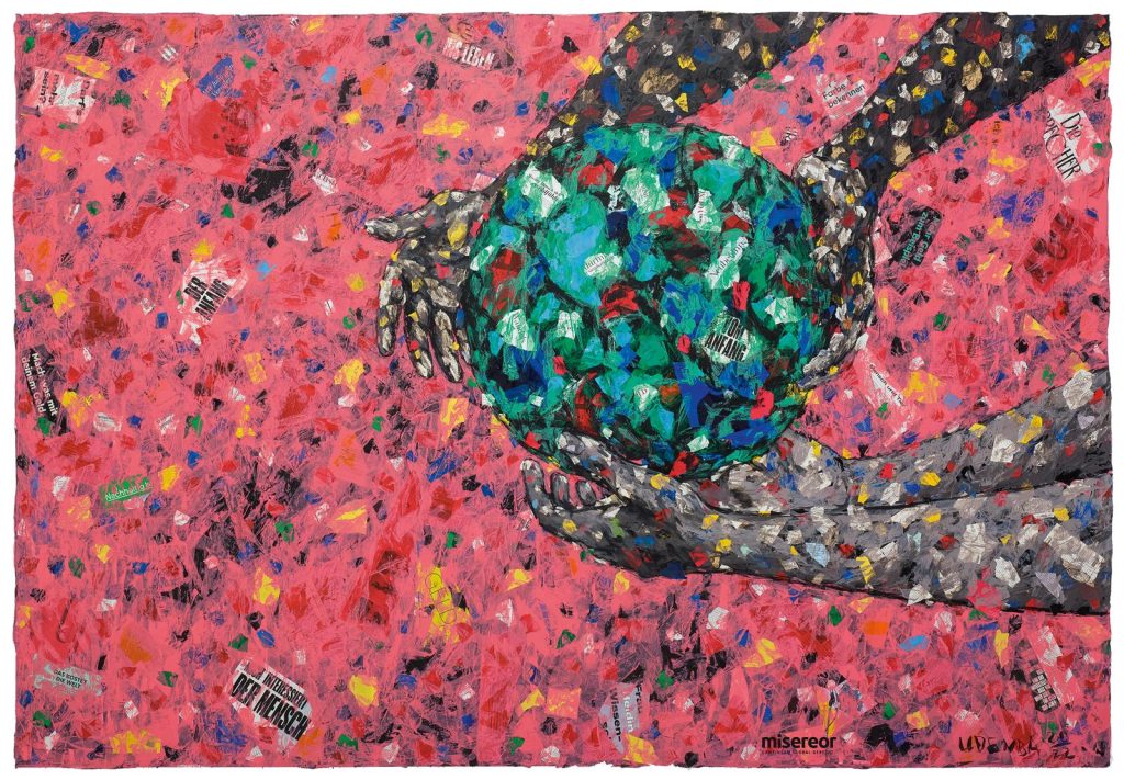 Das farbenstarke Bild ist von einem afrikanischen Künstler als Collage aus vielen ausgerissenen Zeitungsschnipseln aufgebaut: Nachrichten, Infos, Fakten, Fakes – Schicht um Schicht reißt und klebt der Künstler diese Einzelteile und komponiert aus ihnen etwas Neues.